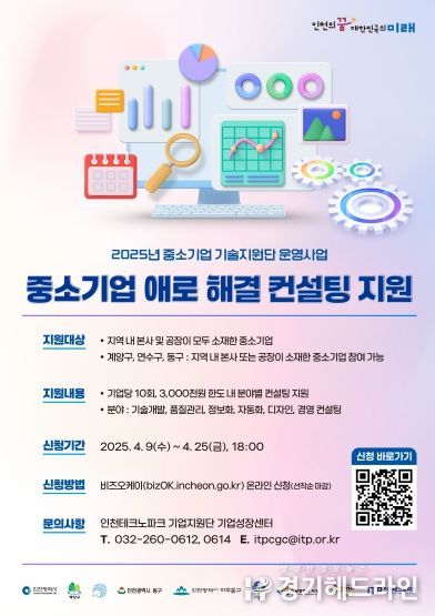 참여 신청은 오는 4월 25일까지 비즈오케이을 통해 접수하며, 자세한 내용은 비즈오케이를 통해 확인하거나 인천TP 기업성장센터로 문의하면 된다.