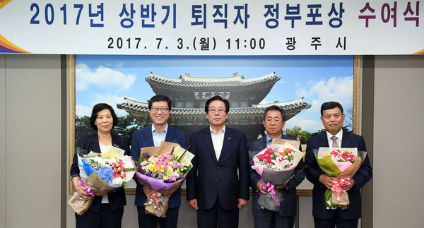 이날 이희원 전 광주시 부시장을 포함한 4명의 퇴직공무원은 지역발전을 위해 힘쓴 공적을 인정받아 정부포상을 수여받았다.