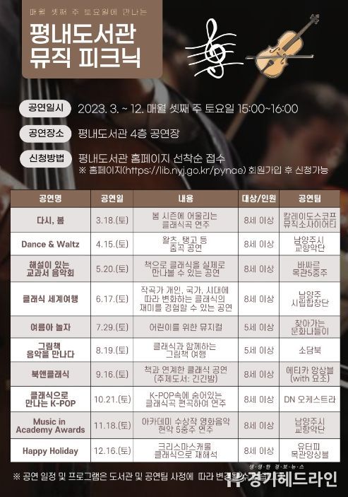 [경기헤드라인=김성구 기자] 남양주시 평내도서관은 올해 3월부터 12월까지 매월 셋째 주 토요일마다 '뮤직 피크닉' 행사를 운영하며 다양한 공연으로 시민들을 만날 예정이다.