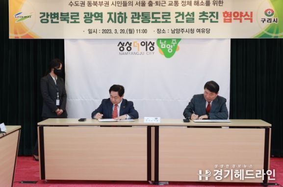 [경기헤드라인=김성구 기자] 남양주시는 20일 시청 여유당에서 구리시(시장 백경현)와 ‘강변북로 광역 지하 관통 도로(남양주시 수석동~강변북로 한남대교) 건설 추진’을 위한 업무 협약을 체결했다.
