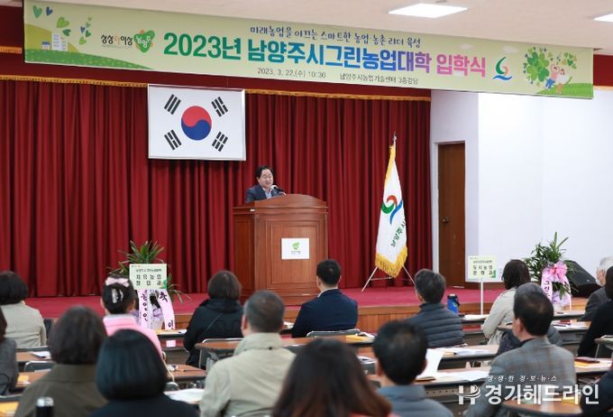 이날 입학식은 남양주시그린농업대학 학장인 주광덕 남양주시장을 비롯해 김현택 남양주시의회 의장, 동문회원, 입학생 등이 참석한 가운데 개회식, 경과보고, 교표 수여, 입학 식사, 축사, 대학 운영 안내 등의 순서로 진행됐다.