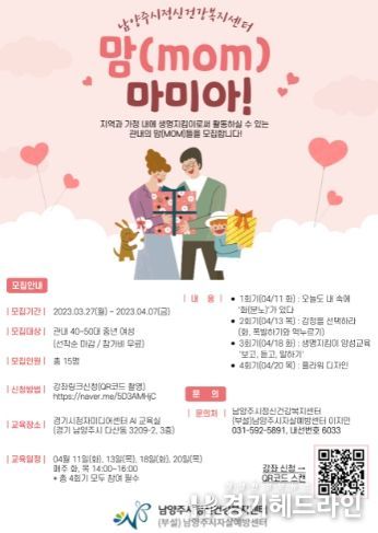 [경기헤드라인=김성구 기자] 남양주시정신건강복지센터 (부설)남양주시자살예방센터는 오는 4월 11일부터 4월 20일까지 총 4회기에 걸쳐 중년 여성 생명 지킴이 양성 프로그램 ‘맘(mom)마미아’를 운영한다.