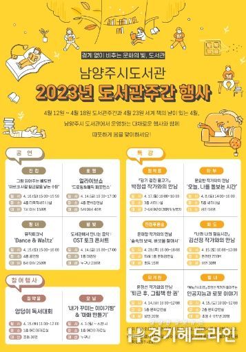 이외에도 원화 전시와 북스타트 책꾸러미 배부 등 책과 도서관에 흥미를 느낄 수 있는 프로그램이 운영되며, 정약용도서관 ‘엉덩이 독서대회’와 오남도서관 ‘내가 꾸미는 이야기방’ 등의 참여 행사가 진행될 계획이다.