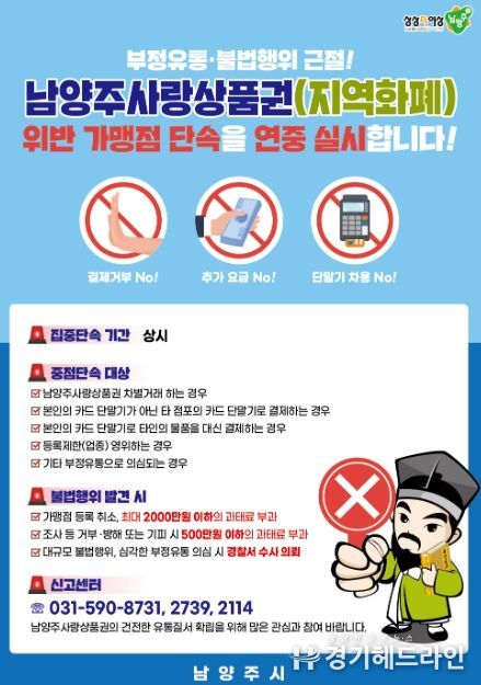 [경기헤드라인=김성구 기자] 남양주시는 오는 10일부터 28일까지 남양주사랑상품권(지역화폐)의 건전한 유통 질서 확립을 위해 부정유통 일제 단속을 실시한다.