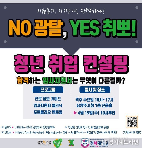 [경기헤드라인=김성구 기자] 남양주시는 오는 19일부터 연말까지 매월 격주 수요일마다 경복대학교와 함께 ‘청년 취업 컨설팅’을 운영하고, 컨설팅에 참여할 청년을 선착순으로 상시 모집한다고 7일 밝혔다.