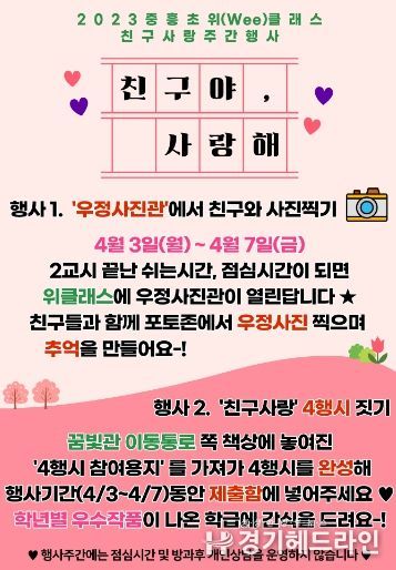또한 이인희 교장은 “학급과 위클래스 등 학교 곳곳에서 열리는 다양한 친구사랑주간 행사를 통해 중흥초 학생들이 우정에 대해 생각해 보고 서로의 소중한 마음을 나눌 수 있길 바란다.”라고 말했다.