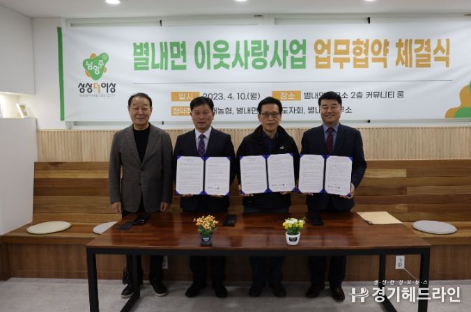 [경기헤드라인=김성구 기자] 남양주시 별내면(면장 김현태)은 별내농협(조합장 구본국) 및 별내면농촌지도자회(회장 이군훈)와 10일 별내면 기관단체협의회(회장 김윤원) 등 지역 내 주요 기관·단체 관계자들이 참석한 가운데 별내면사무소에서 지역 발전을 위한 ‘별내면 이웃사랑사업 업무 협약식’을 가졌다.