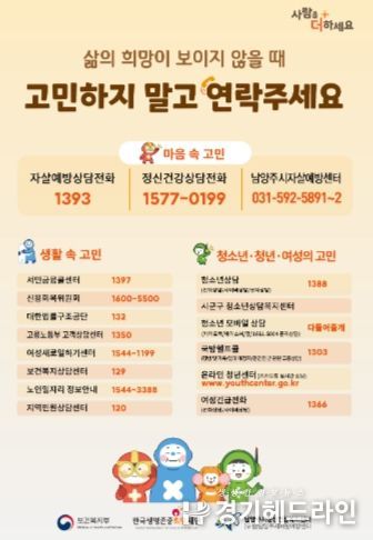 한편, 남양주시자살예방센터는 자살 고위험군 집중 사례 관리자를 대상으로 자살 위험성 점검 및 방문, 내소 등을 통한 1:1 사례관리 서비스를 제공하고 있으며, 자살 위험군과 긴급 지원 대상을 적극 발굴해 적절한 지원을 받을 수 있도록 긴급 지원 제도 등을 운영하고 있다.
