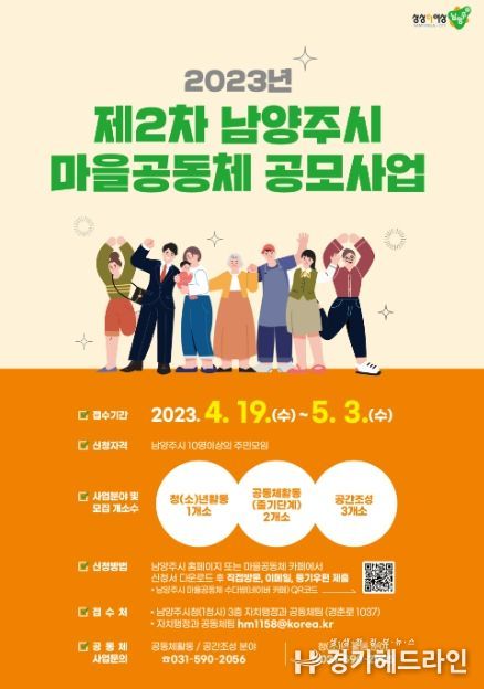 [경기헤드라인=김성구 기자] 남양주시는 주민들의 자발적인 참여를 바탕으로 이웃과 소통·교류하며 마을 공통의 문제를 해결하고, 지역 사회 발전에 기여하는 공동체 활동을 지원하기 위해 ‘2023년 제2차 마을공동체 공모 사업’을 추진한다.