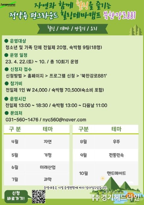 힐링테마캠프‘북한강로881’은 전일제와 숙박형 캠프로 월별 △자연 △미래산업 △우주 △전통체험 등의 주제를 선정하여 청소년 또는 가족과 함께 서로 간 정서적 교감과 협동심을 키우는 프로그램으로 진행된다.