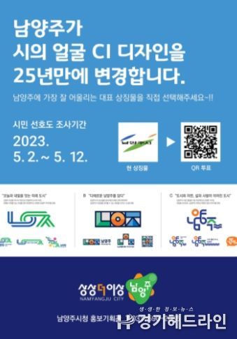 [경기헤드라인=김성구 기자] 남양주시는 오는 12일까지 ‘새로운 남양주시 대표 상징물(CI) 디자인’에 대한 시민 선호도 조사를 실시한다.