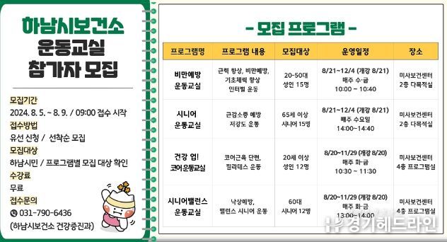 하남시보건소 운동교실 참가 희망자는 모집 안내문을 참고해 오는 5일부터 9일까지 하남시 건강증진과 건강증진팀에 전화로 신청하면 된다.