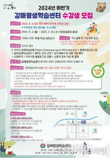 [경기헤드라인=문수철 기자] 구리시는 접수는 8월 6일부터 2024년 하반기 갈매평생학습센터 과정 수강생을 선착순으로 모집한다.
