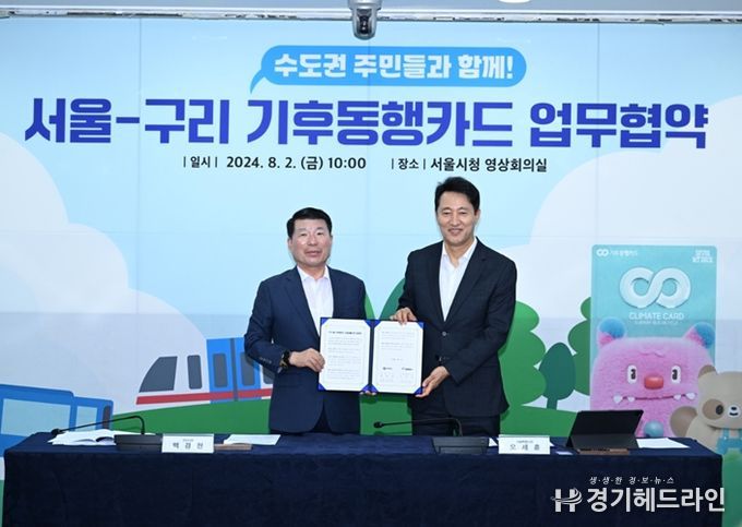 [경기헤드라인=문수철 기자] 백경현 구리시장은 8월 2일 서울시청에서 오세훈 서울특별시장과 만나 ‘구리시-서울시 기후동행카드 참여 업무협약’을 체결했다.