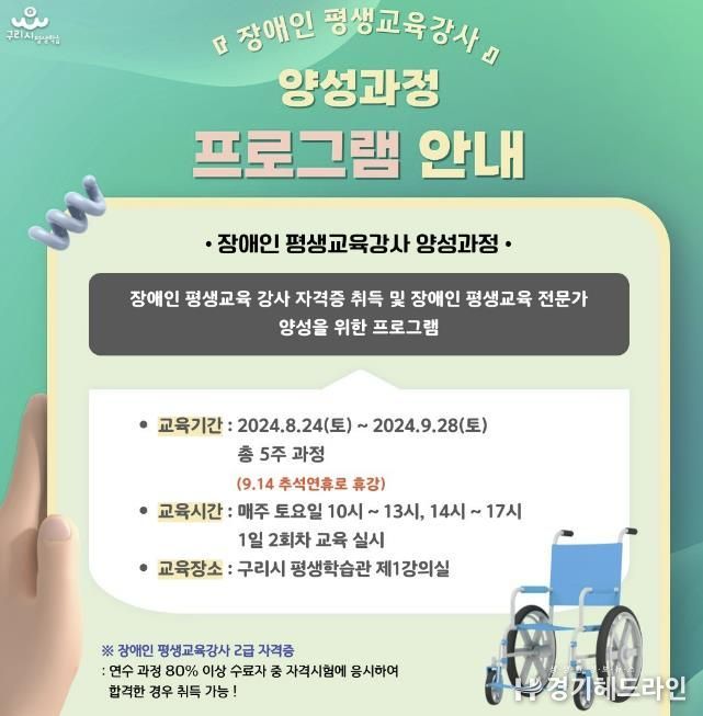 [경기헤드라인=문수철 기자] 구리시는 오는 8월 24일부터 9월 21일까지 구리시 평생학습관에서 ‘2024년 구리시 장애인 평생교육 리더 양성 과정’을 운영한다.