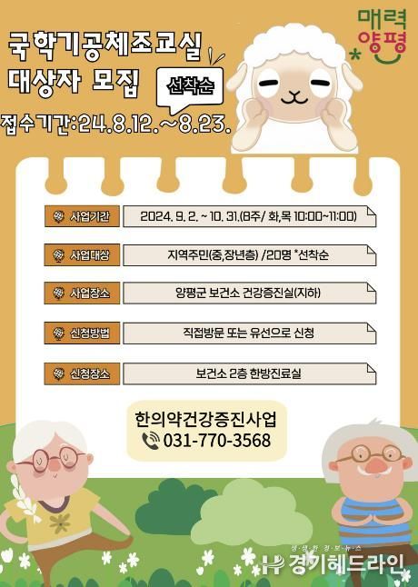 [경기헤드라인=문수철 기자] 양평군은 관내 거주 중장년층 20명을 대상으로 건강한 생활습관 형성 및 신체적 활동 촉진을 위해 이달 27일부터 오는 10월 31일까지 8주간 국학기공체조교실을 운영한다고 밝혔다.