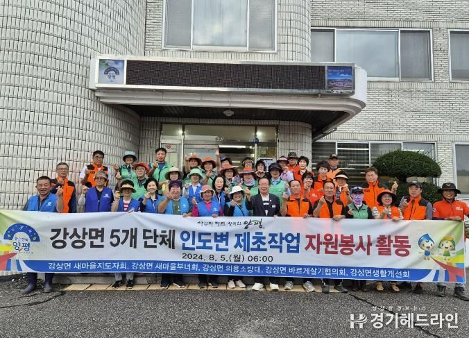 이날 5개 단체는 더운 날씨에도 휴가철을 맞아 강상면을 방문하는 여행객들에게 깨끗한 이미지를 홍보하고, 쾌적한 인도변을 조성하고자 구슬땀을 흘리며 작업에 참여했다.
