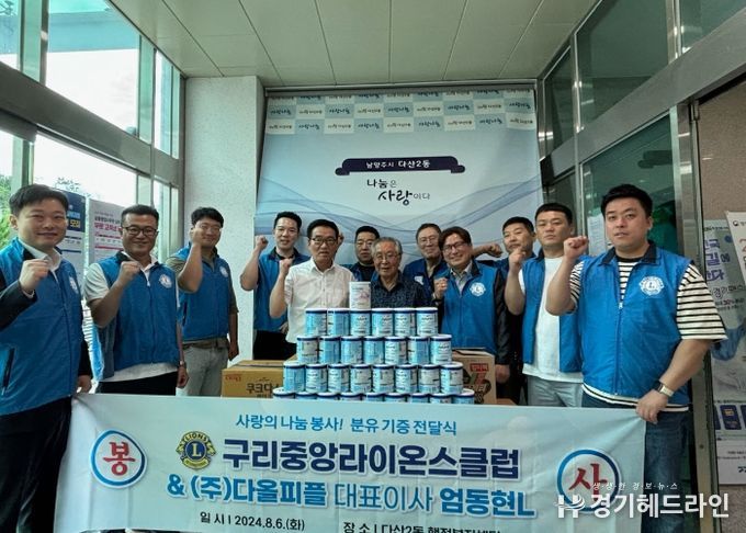 [경기헤드라인=문수철 기자] 구리중앙라이온스클럽은 6일 다산2동 경로당에 120만 원 상당의 특수 분유 50개를 전달했다.