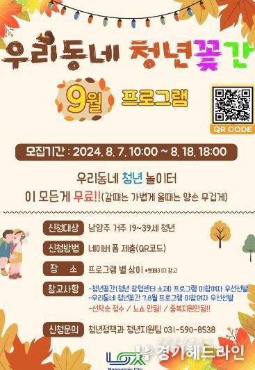 [경기헤드라인=문수철 기자] 남양주시는 7일부터 ‘우리동네 청년꽃간’에서 진행되는 청년 대상 9월 무료 문화프로그램 참여 신청을 받는다.