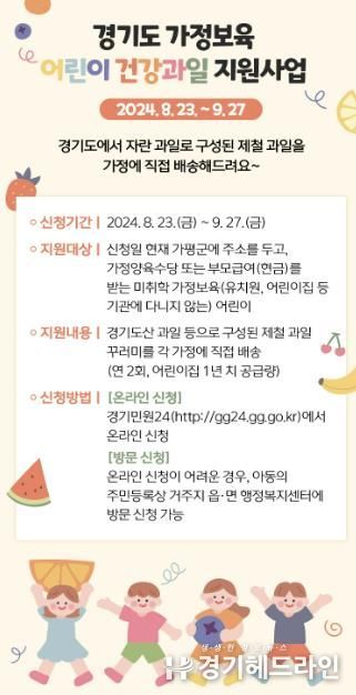 ‘가정보육 어린이 건강과일 지원사업’은 유치원이나 어린이집에 다니지 않고, 가정에서 돌봄을 받는 어린이들에게 신선한 국내산(경기도산 우선) 제철과일을 제공하는 사업이다. 고품질의 신선한 제철과일 섭취를 통해 어린이의 식습관 개선과 건강 증진을 위한 것이다.