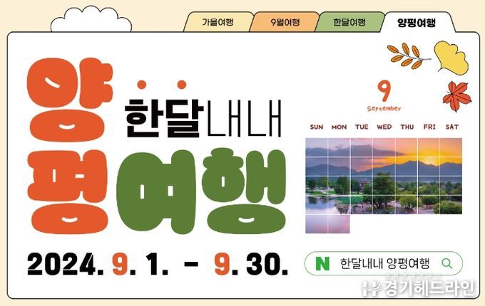 [경기헤드라인=문수철 기자] 양평군은 9월 한 달 동안 양평을 즐길 수 있는 ‘한달내내 양평여행’을 진행한다고 16일 밝혔다.