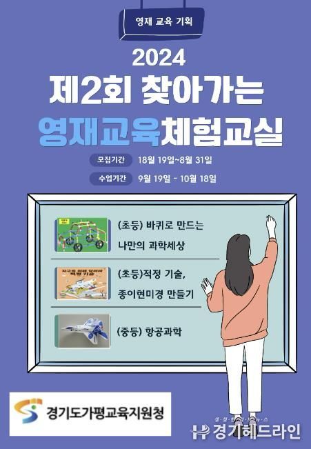 [경기헤드라인=문수철 기자] 가평교육지원청은 가평 지역이 넓고 지리적 요인으로 인하여 학생들이 영재교육에 참여하지 못하는 상황에서 초등학생(4~6학년), 중학생(1~3학년)들에게 영재교육 기회를 제공하기 위해 작년에 이어 2024년 제2회"찾아가는 영재교육체험교실"프로그램을 운영한다고 말했다. 제2회"찾아가는 영재교육체험교실"프로그램은 8월 19일 ~ 8월 30일까지 신청을 받아 9월 19일 ~ 10월 18일까지 운영될 예정이다.