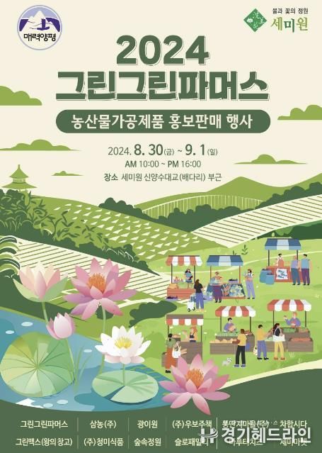 이번 행사는 8월 30일부터 9월 1일까지 세미원에서 열린다. ‘그린그린파머스’는 양평군 농산물가공지원센터에서 창업 보육된 위탁 생산자들의 공동브랜드로, 위탁 생산자들을 포함한 지역 내 우수 농식품 제조 가공업체 10개소 이상이 함께 참여한다.