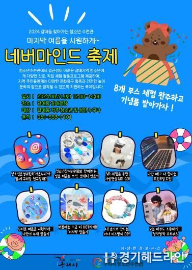[경기헤드라인=문수철 기자] 구리시청소년재단 청소년수련관은 8월 31 12:00~14:00까지 갈매동 갈매광장에서 온 가족 함께 즐길 수 있는 ‘갈매동 찾아가는 청소년수련관 - 네버마인드 축제’를 운영한다.