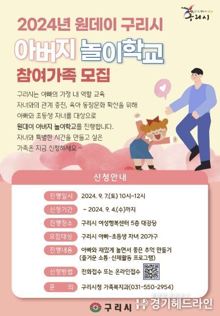 모집인원은 20가정이며, 구리시에 거주하는 아버지와 초등생 자녀라면 누구든지 참여할 수 있다. 참여 방법은 오는 9월 4일까지 구리시청 가족복지과로 전화 신청하거나 온라인(QR코드 접속)으로 신청하면 된다.