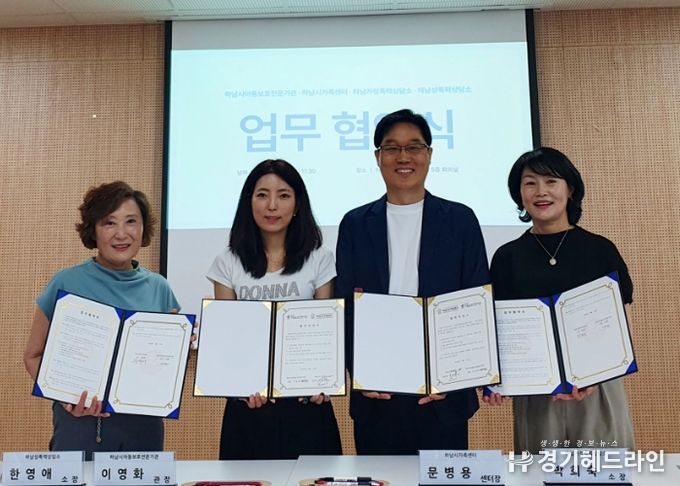 [경기헤드라인=문수철 기자] 학대피해아동 가정의 사례관리와 아동학대 예방 교육·홍보 등의 사업을 수행하고 있는 하남시아동보호전문기관은 지난 8월 12일과 16일 하남시 관내 가족복지를 위한 유관기관인 하남시가족센터, 하남가정폭력상담소, 하남성폭력상담소, 하남시육아종합지원센터와 업무 협약을 체결했다.