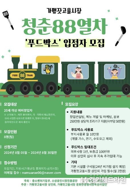 [경기헤드라인=문수철 기자] 가평군은 가평잣고을시장에서 지역경제 활성화를 위해 함께할 ‘청춘88열차 푸드박스’ 입점 희망자를 모집하고 있다고 밝혔다.