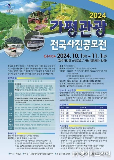 [경기헤드라인=문수철 기자] 가평군이 군의 관광자원을 널리 알리고 특색있는 관광 이미지를 발굴·홍보하기 위해 ‘2024년 가평관광 전국사진공모전’을 개최한다.