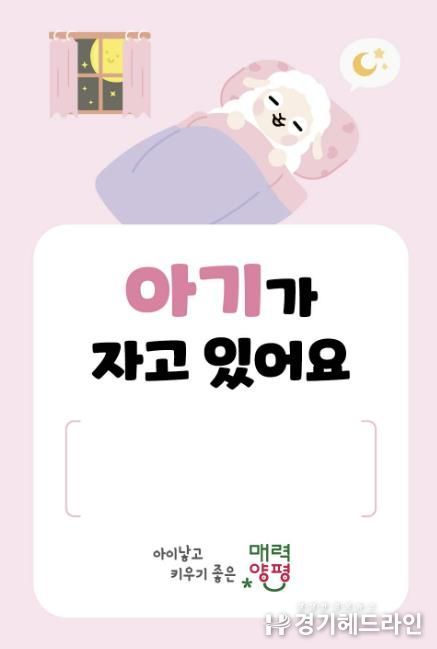 [경기헤드라인=문수철 기자] 양평군은 오는 26일부터 출산가정이 휴식과 안전에 대한 배려를 받을 수 있도록 ‘아기가 자고 있어요’ 스티커를 제작해 관내 출생신고를 하는 가정에 배부한다고 밝혔다.