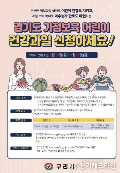 [경기헤드라인=문수철 기자] 구리시는 8월 23일부터 9월 27일까지 ‘건강 과일 공급사업’ 희망자 신청을 받는다.