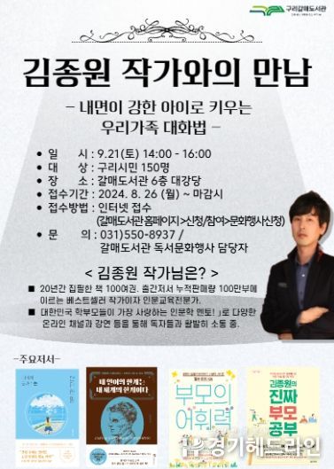[경기헤드라인=문수철 기자] 구리시 갈매도서관에서는 독서의 달을 기념해 9월 21일 토요일 오후 2시 갈매도서관 6층 대강당에서 ‘김종원 작가와의 만남’을 개최한다.