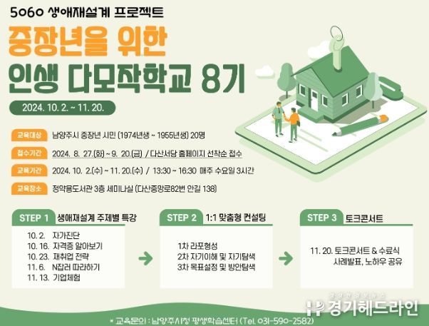 [경기헤드라인=문수철 기자] 남양주시는 중장년의 새로운 인생 준비와 안정적인 노후생활을 위한 생애 재설계 교육 과정인 인생다모작학교 8기를 접수한다고 23일 밝혔다.