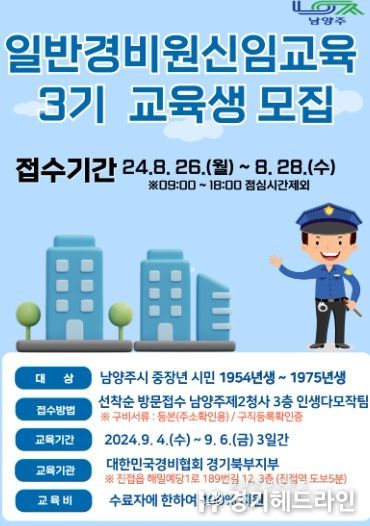 [경기헤드라인=문수철 기자] 남양주시는 중장년 남양주시민을 대상으로 일반경비원 신임교육 3기 및 타일기능사 자격증 대비과정 교육생을 모집한다고 23일 밝혔다.