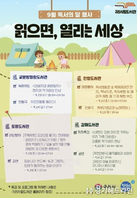 [경기헤드라인=문수철 기자] 구리시 시립도서관은 9월 독서의 달을 맞이하여 한 달간 북콘서트, 강연, 공연, 특강 프로그램, 야외행사 체험부스 운영 등 전 계층의 시민이 참여할 수 있는 다채로운 독서문화행사를 운영할 예정이다.
