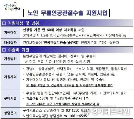 [경기헤드라인=문수철 기자] 구리시는 보건복지부 노인건강관리사업 수행기관인 노인의료나눔재단과 협력하여 '노인 무릎인공관절수술 지원사업'을 추진하고 있다고 밝혔다.