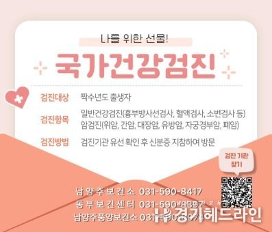 [경기헤드라인=문수철 기자] 남양주시는 우리나라 주요 사망원인인 암을 조기에 발견해 치료율을 높이고, 암으로 인한 사망률을 줄이기 위해 국가건강검진을 받도록 적극 독려하고 있다.