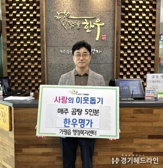 [경기헤드라인=문수철 기자] 가평군 가평읍 달전리에 위치한 가평축협 한우명가(본점)는 매주 수요일 가평읍에 한우명가 곰탕 5세트를 후원하고 있다. 이러한 한우명가의 정기후원은 2018년 1월, 가평읍지역사회보장협의체와 협약을 맺은 이후 매주 빠짐없이 진행되고 있다.