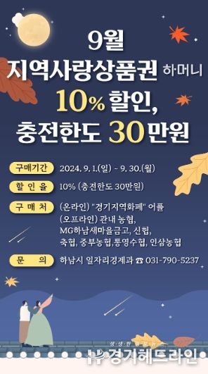[경기헤드라인=문수철 기자] 하남시가 9월 추석 명절을 맞이하여 지역사랑상품권인 하머니 인센티브를 확대한다고 밝혔다.