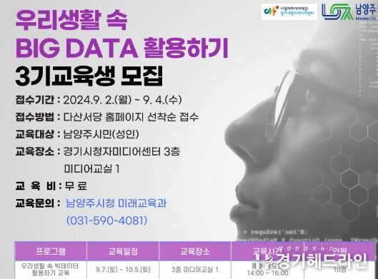 [경기헤드라인=문수철 기자] 남양주시는 남양주시민의 신기술 역량을 강화하고 4차산업의 수요에 맞는 인력양성을 위해 경기시청미디어센터와 ‘우리 생활 속 빅데이터 활용하기 교육 3기’를 운영한다고 30일 밝혔다.