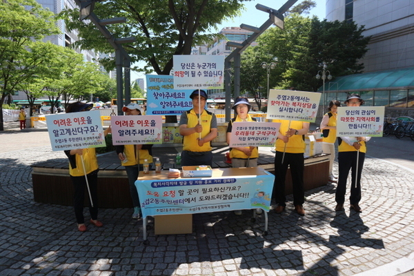 ▲ 지난 25일 주엽역 광장에서 복지사각지대발굴을 위한 캠페인을 실시하고 있다.[경기헤드라인=김윤종 기자] 고양시 일산서구 주엽2동 지역사회보장협의체는 지난 25일 주엽역 광장에서 복지사각지대발굴을 위한 캠페인을 실시했다.