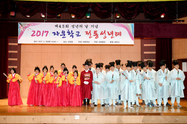 ▲ 자운학교 학생 성년례[경기헤드라인=김윤종 기자] 파주시와 교하향교는 지난달 30일 자운학교 대강당에서 ‘자운학교 전통 성년례’를 개최했다.