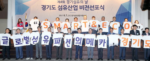 [경기헤드라인=김윤종 기자] 경기도는 7일 오후 2시 30분 양주에 위치한 경기섬유종합지원센터에서 남경필 경기도지사와 정명효 경기섬유산업연합회장, 경기지방중소기업청 김영신 청장, 주한 타지키스탄 샤리프 조사(Yusuf Sharifzoda) 대사, 이성호 양주시장, 김종천 포천시장, 오세창 동두천 시장, 섬유‧패션산업 종사자 약 200명이 참석한 가운데 제4회 섬유의 날 기념식을 열고, 이런 내용을 담은 ‘경기도 섬유산업 육성 종합계획’을 발표했다.