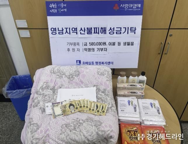 익명의 기부자는 호매실동 행정복지센터를 방문하여 “최근 영남 지역에서 일어난 산불로 많은 분들이 피해를 보았는데, 그들을 돕고 싶어서 기부하게 됐다”라고 전했다.