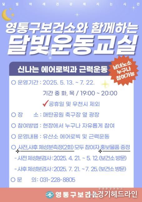 [경기헤드라인=문수철 기자] 수원 영통구보건소가 야간 운동 프로그램 ‘달빛운동교실’에 참가할 지역 주민 50명을 5월 9일까지 모집한다.