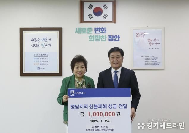 [경기헤드라인=문수철 기자] 수원특례시 장안구 조원2동은 지난 24일, 공정분 조원2동 지역사회보장협의체 위원장이 장안구청을 방문하여 영남지역 대규모 산불 피해 복구 지원을 위한 성금 100만원을 기부했다고 밝혔다.