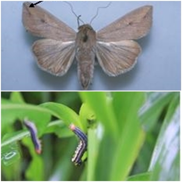 ▲ 사진상단) 멸강나방 성충모습과 하단) 옥수수 가해 유충